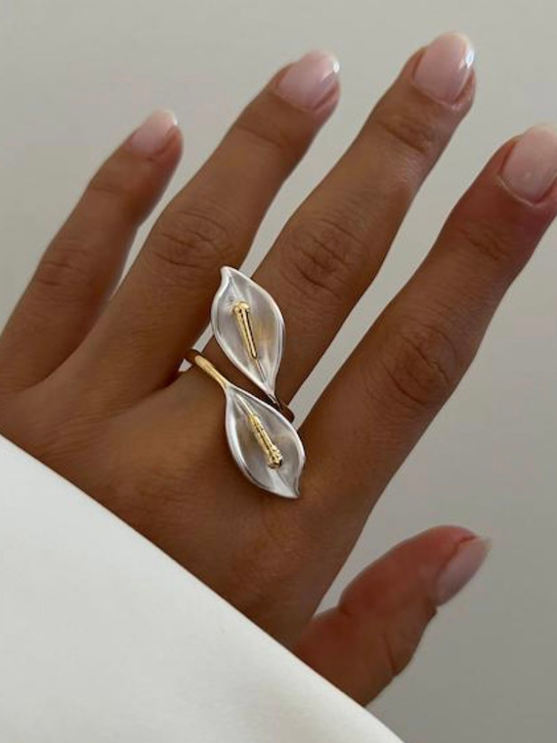این انگشتر زیبا به صورت گل شیپوری دو طرفه با آبکاری مات بسیار جذاب و شیک و مدرن است.