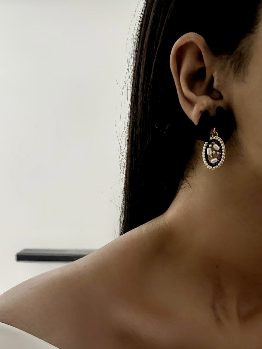 روی گوشواره با نگین و مرواریدهای زیبا تزئین شده و آن را بسیار چشمگیر کرده است.