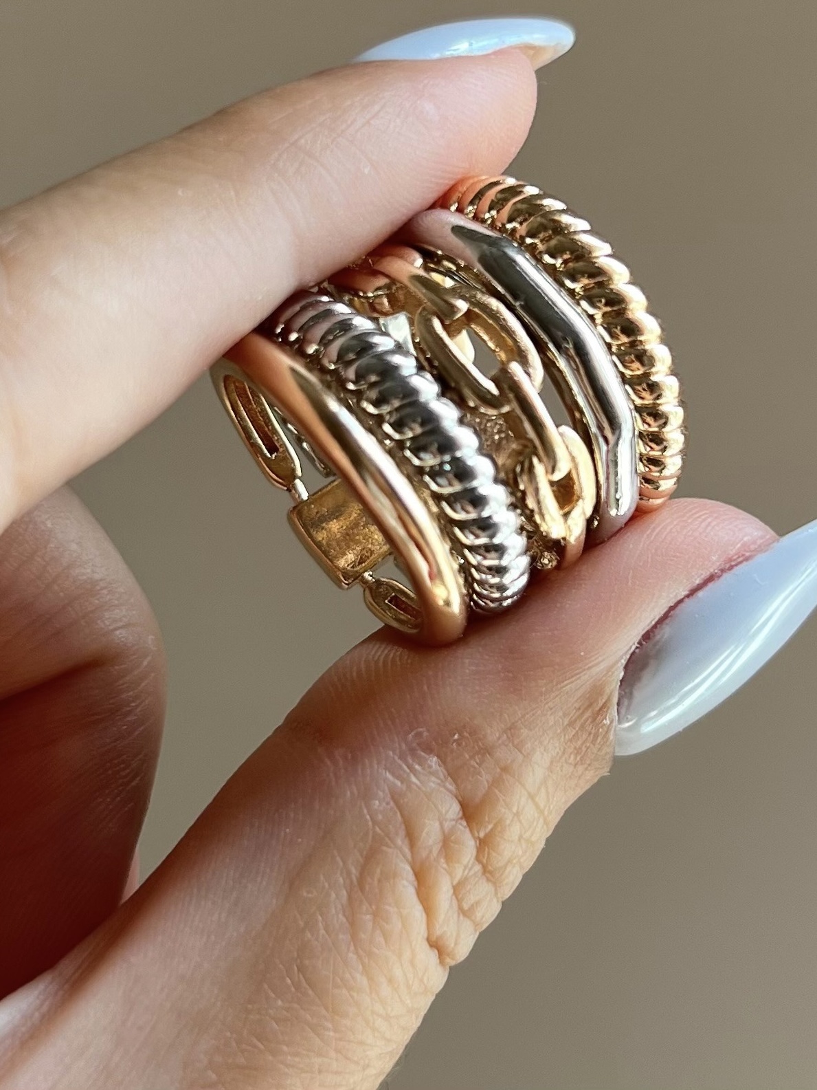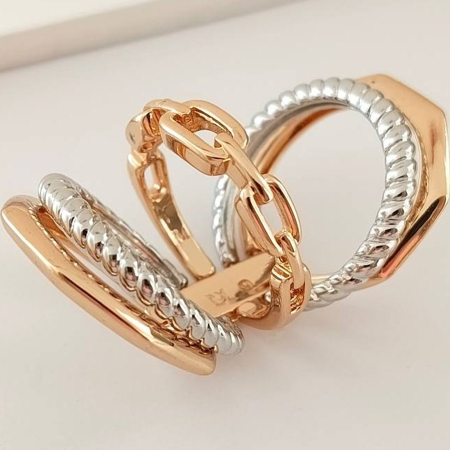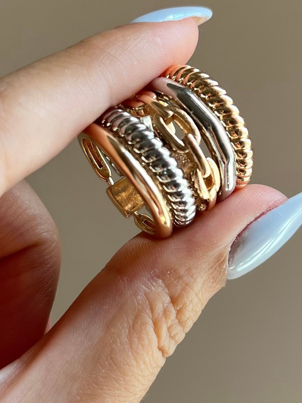 این انگشتر زیبا دارای ۵حلقه میباشد که در دو رنگ طلایی وسیلور کنار هم قرار گرفتهاند و کاملا مشابه نمونه طلا میباشد.